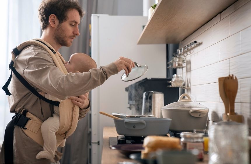 hombre cocinando con bebé en brazos sin tiempo para preparar comida saludable
